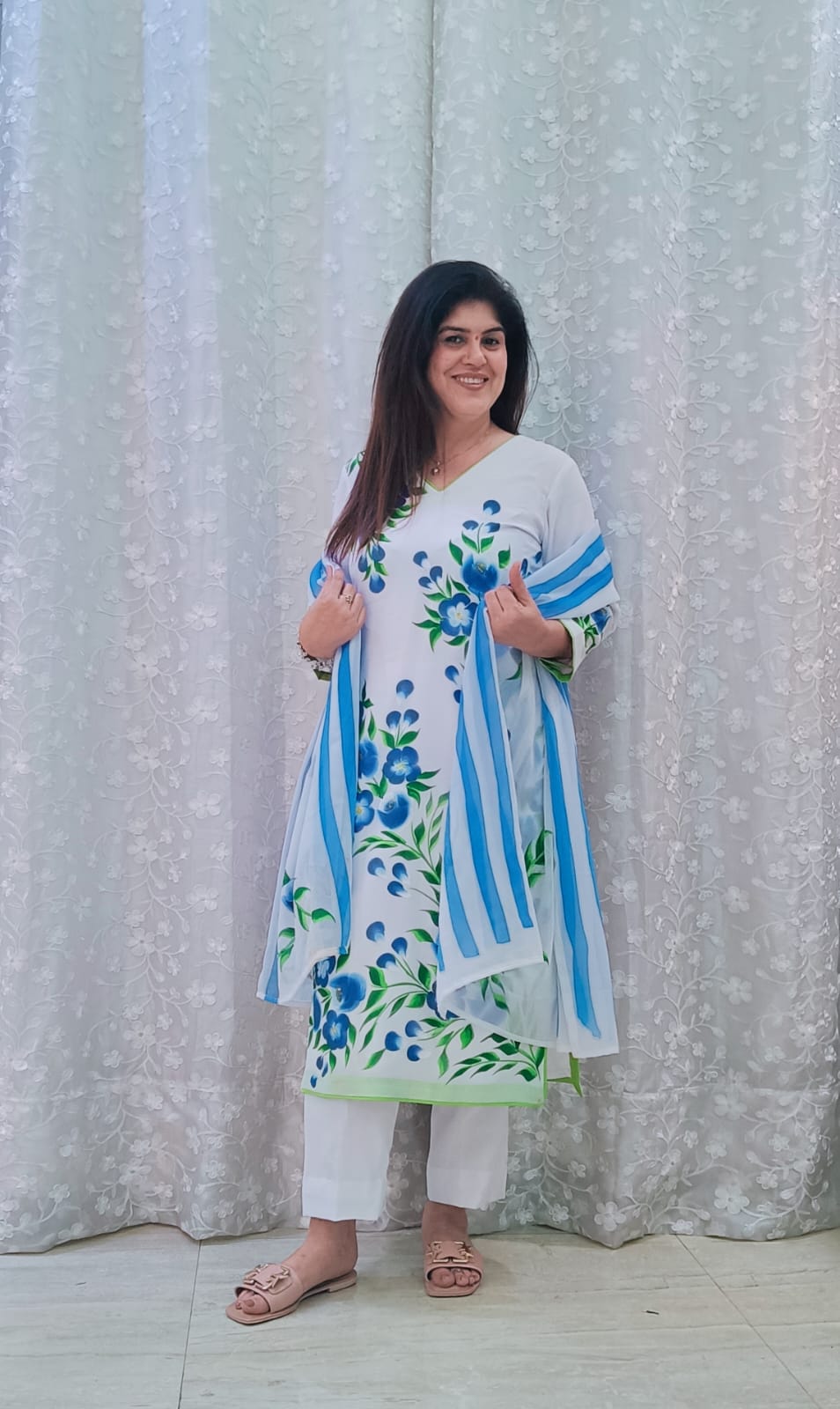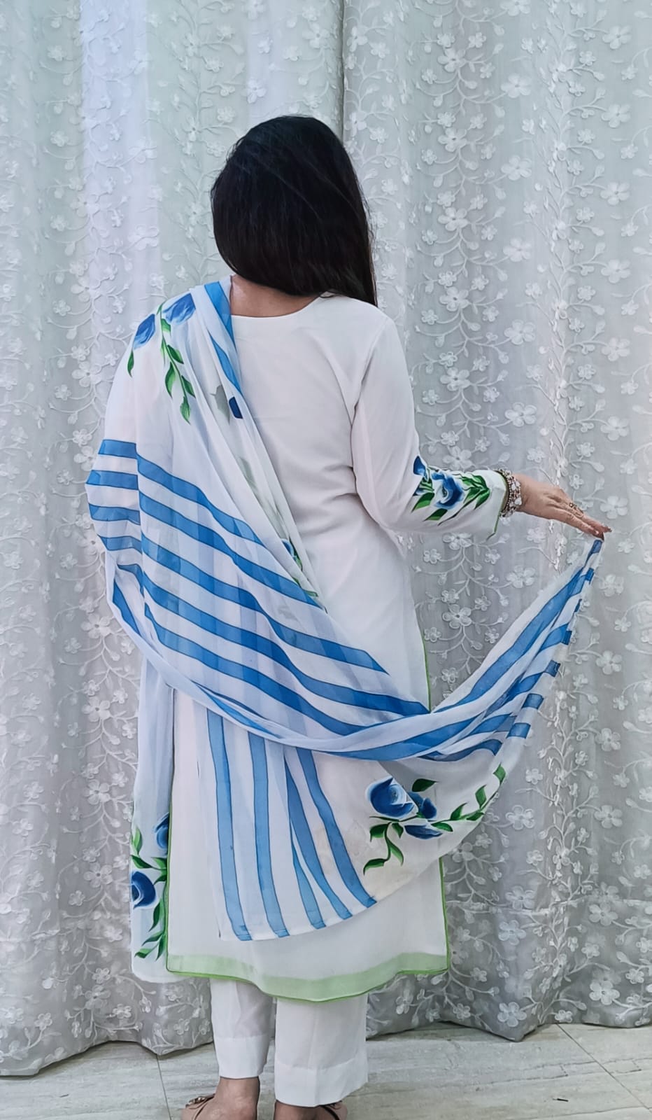 Paired with white trousers, this ensemble ensures comfort and sophistication. The matching handpainted dupatta, beautifully designed with soft blue and white stripes, adds a touch of refinement, completing the look with effortless grace.