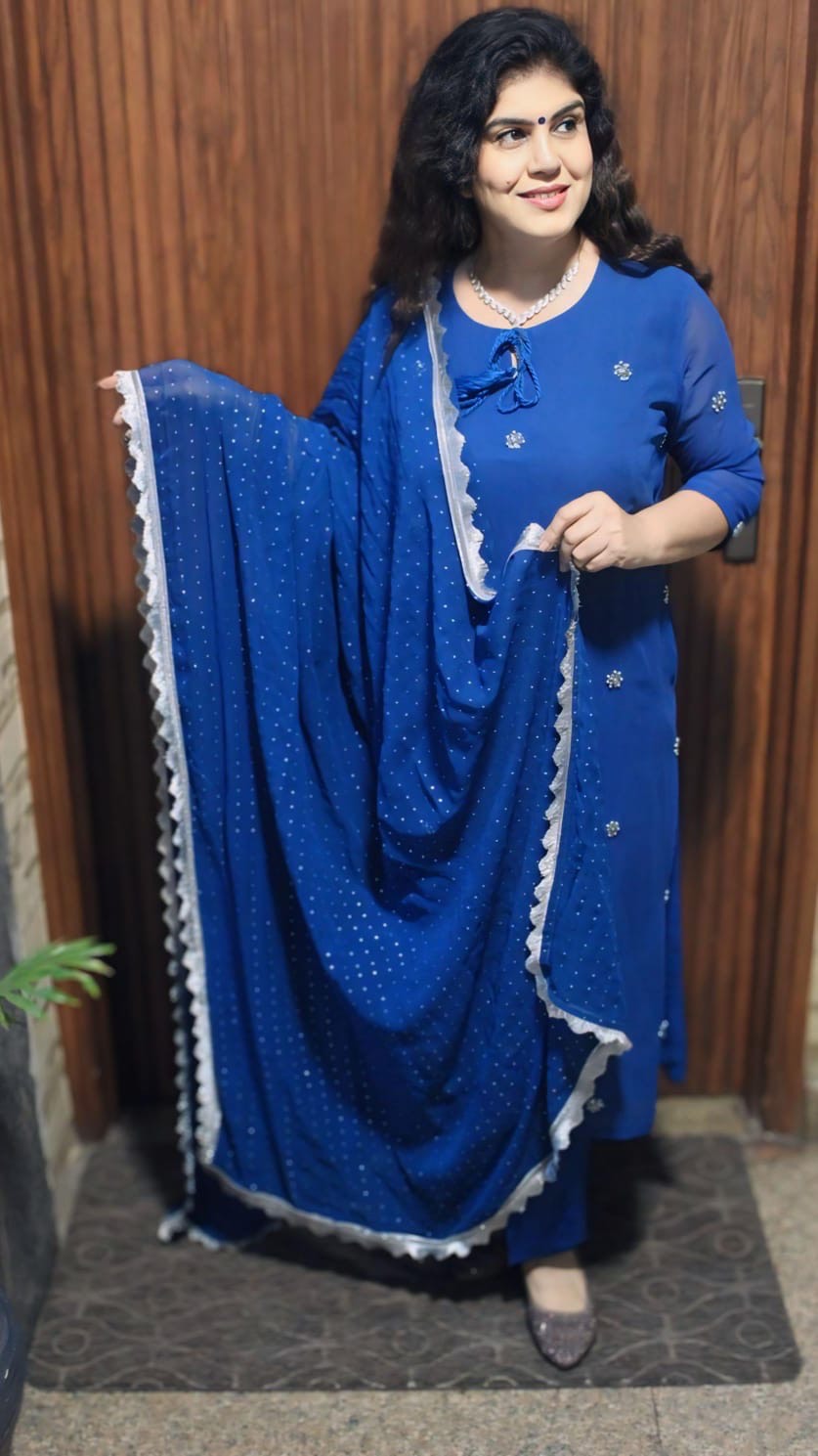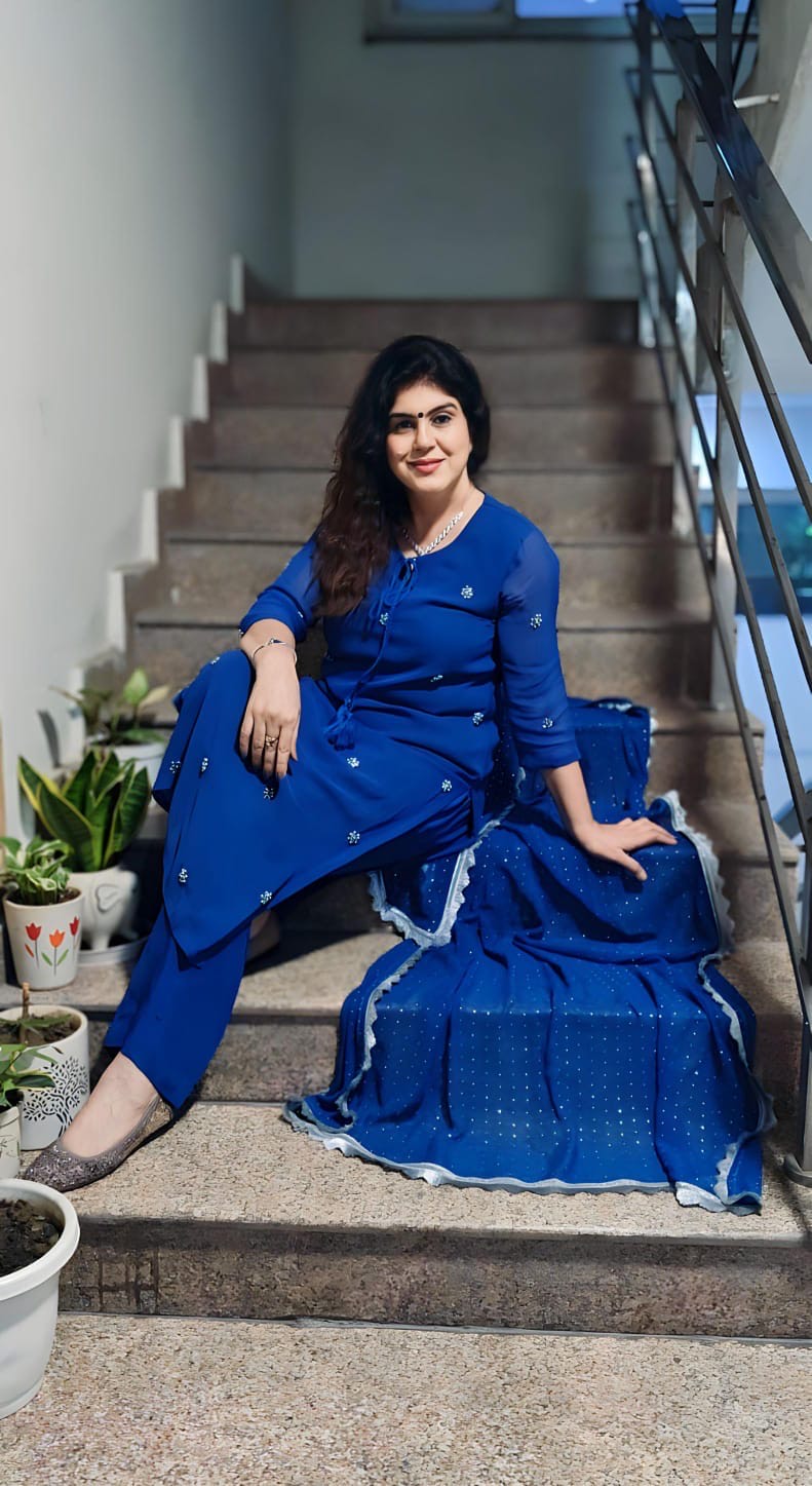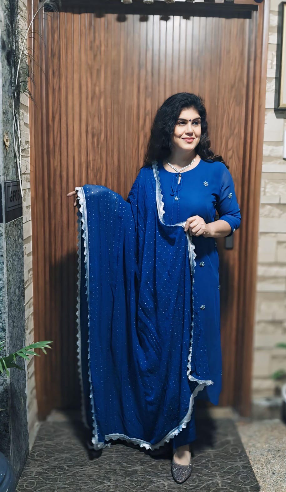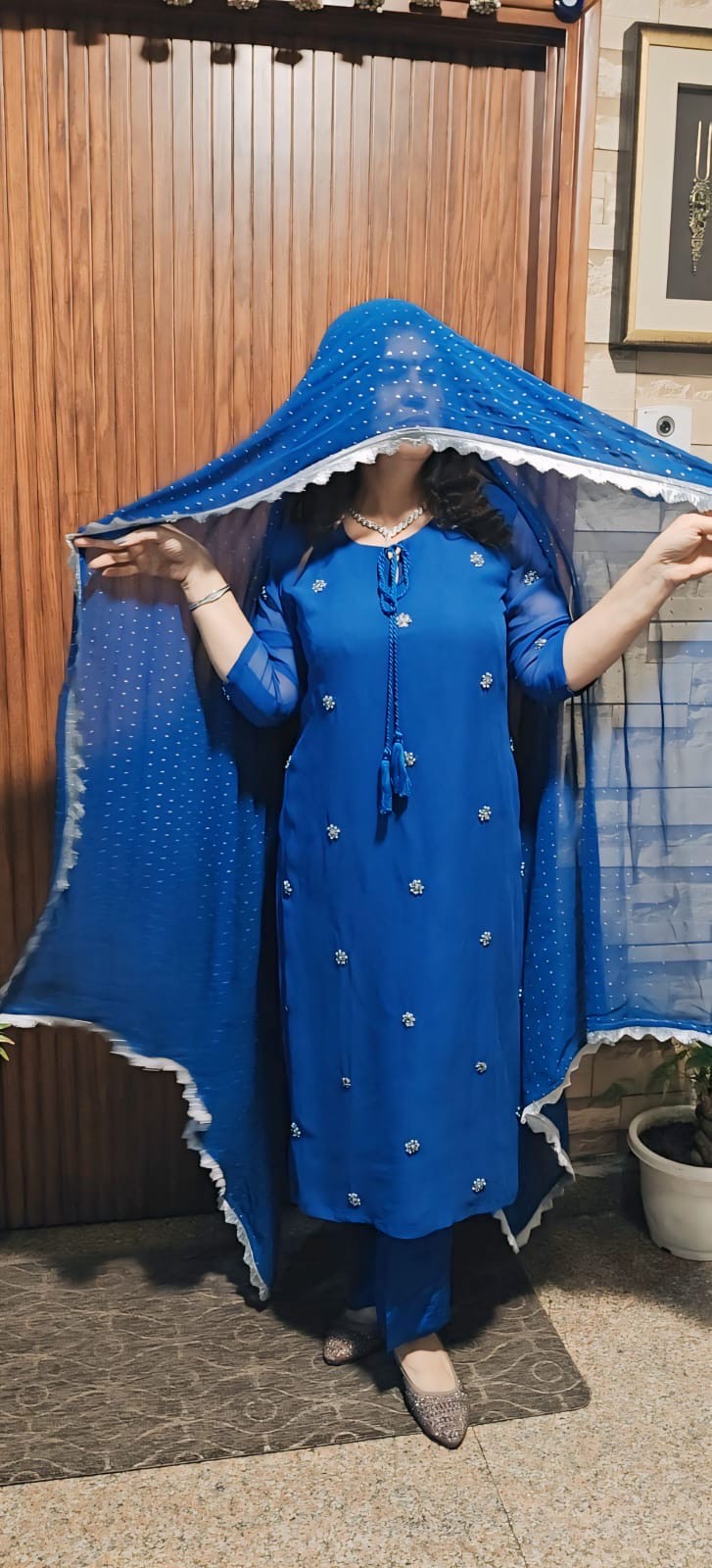 The stunning royal blue suit is the perfect blend of tradition and contemporary elegance. The kurta has subtle yet intricate embellishments that add a touch of sparkle. The three-quarter sleeves and delicate tassel detailing at the neckline enhance its refined appeal while the matching pants offer comfort and style.