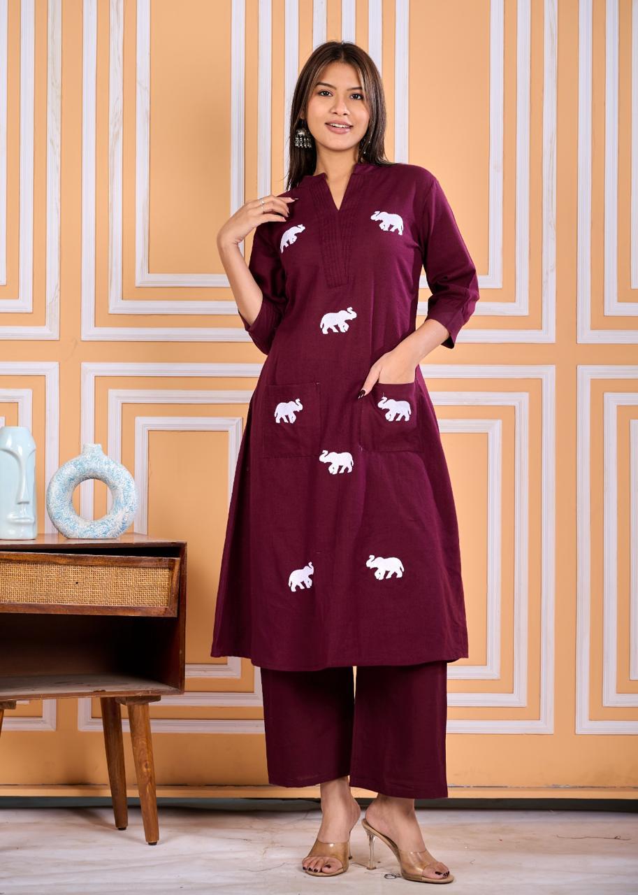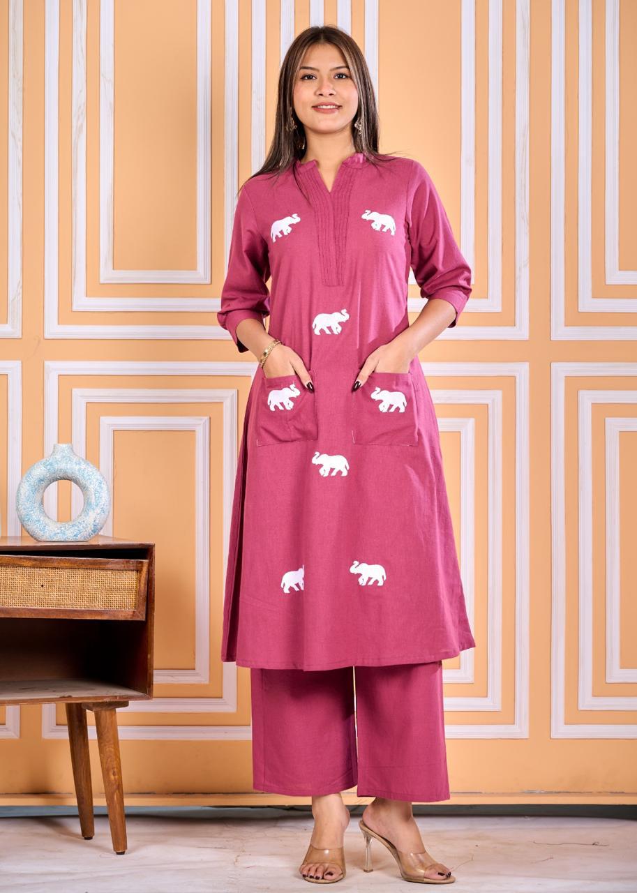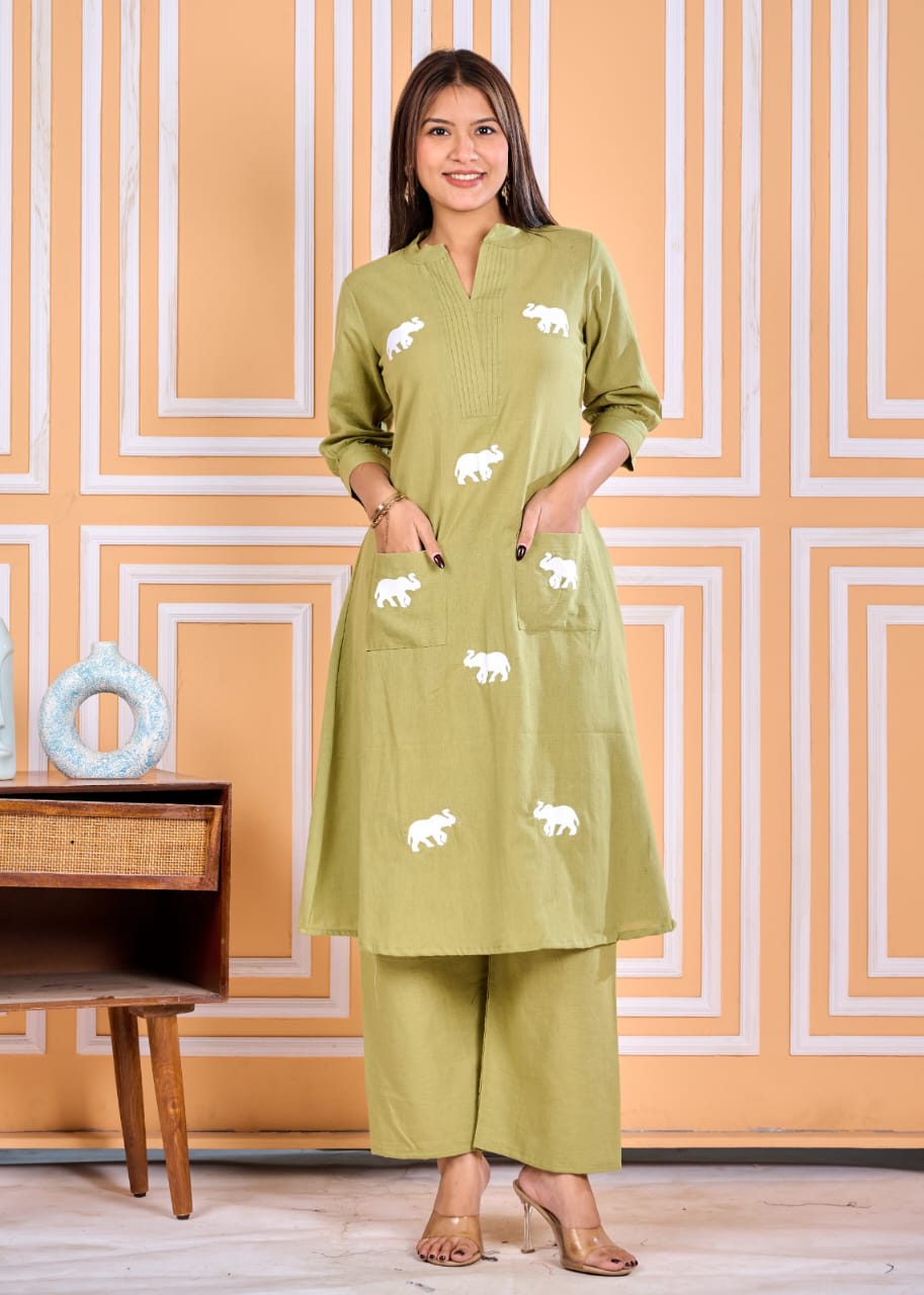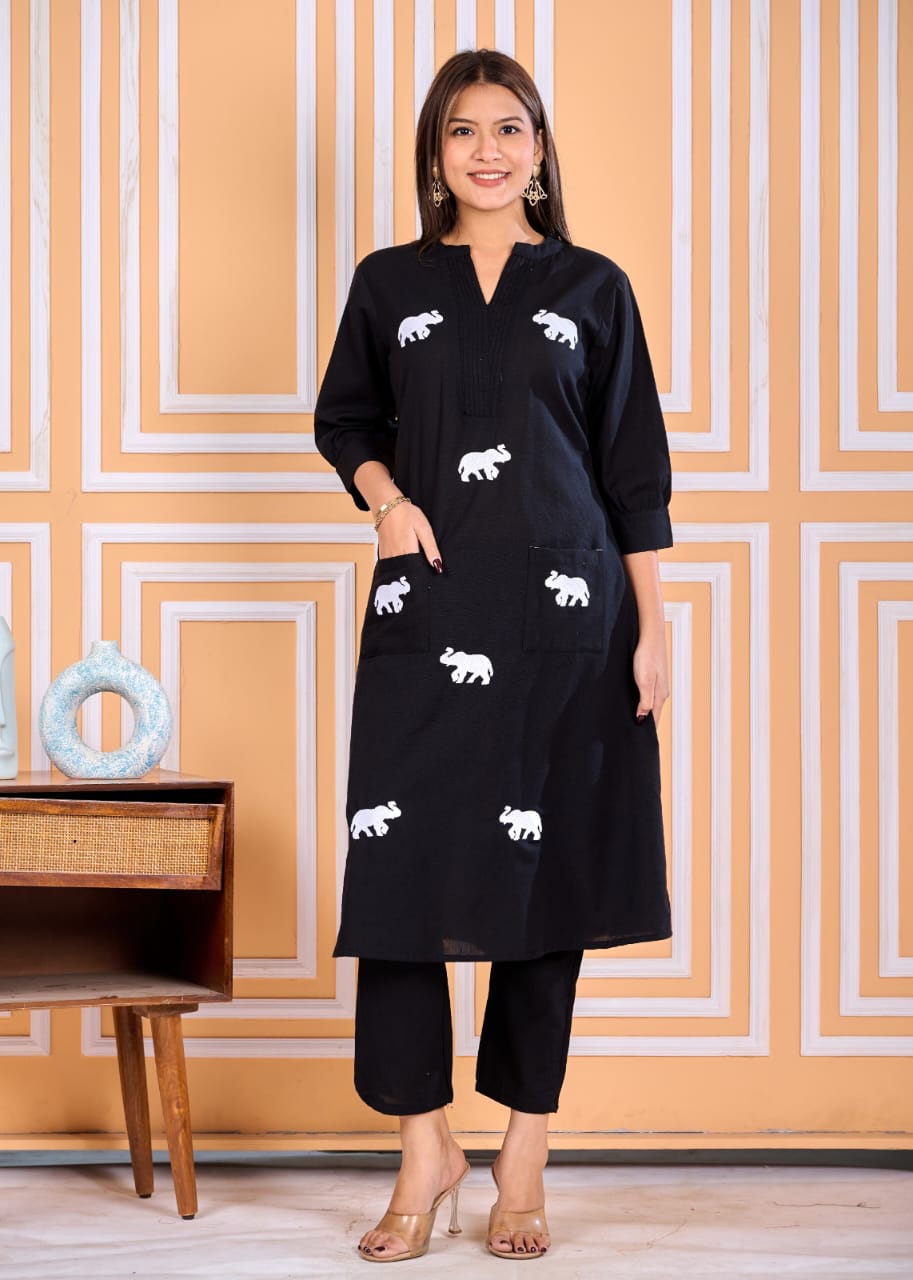 This outfit exudes a refined charm with its kurta adorned with delicate white elephant motifs that add a playful yet sophisticated touch. The kurta features a straight A line-cut, falling just below the knees, with a flattering V-neckline and three-quarter sleeves. Practicality meets style with two front pockets, while the matching wide-legged pants complement the kurta’s relaxed fit. Kurta neck is a flat collar with overlap V & pintucks.