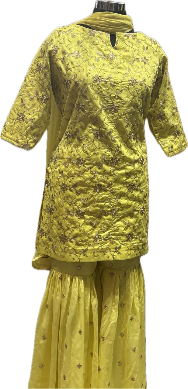 This elegant yellow sharara suit is a beautifully embroidered traditional outfit designed for festive occasions, weddings, and cultural celebrations. The set includes a long kurta, wide-legged sharara pants, and a matching dupatta.